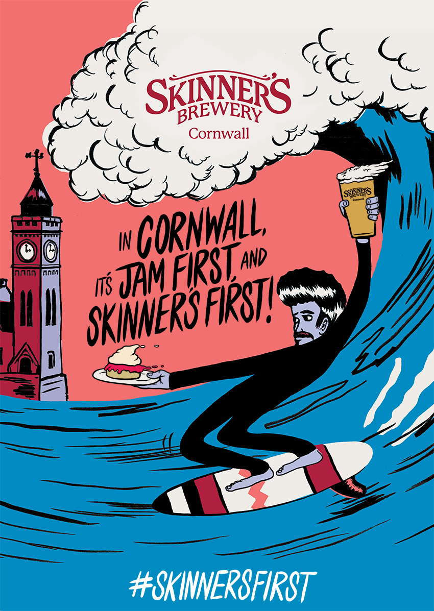 Artist Stevie Gee, the creator of the Porthleven pale ale brand and designer for the likes of Adidas, Vans, Patagonia and Stella McCartney, has updated the original artwork to show a surfer riding a wave, balancing a scone (jam first, of course!) and a pint of Skinner’s beer.