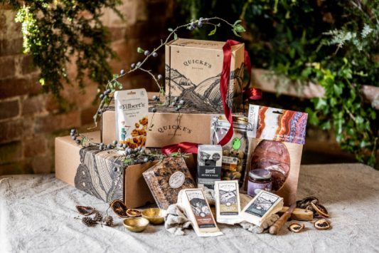 The Festive Feasting Box is priced at £60 and contains Quicke’s Mature Clothbound Cheddar (200g), Quicke’s Goat’s Milk Clothbound Cheese (200g), Quicke’s Oak Smoked Clothbound Cheddar (200g), Clare’s Preserves Spiced Damson Chutney (200g), Peter’s Yard Rye & Charcoal Sourdough Crackers (90g), Cornish Olive Stall ‘The Mix’ (200g), Capreolus Fine Foods Charcuterie Sharing Platter (80g), Mrs Gill’s Country Cakes Fruit Cake (4” Square) and Mr Filbert’s Rosemary Sea Salt Peanuts (110g).