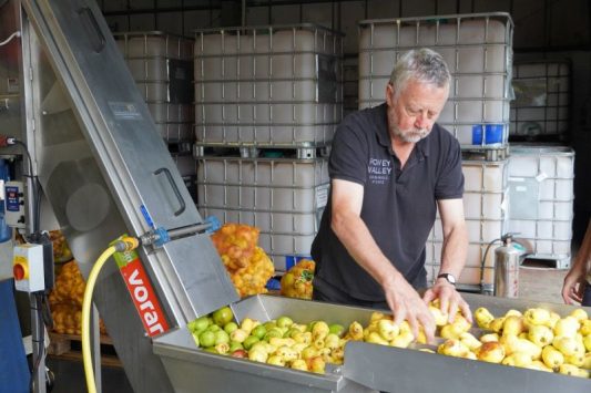 Barrie, who founded Fowey Valley Cidery in 2012, will only take apples from trees which haven’t been sprayed with chemical pest control agents; all apples are washed at the cidery twice before being pressed.