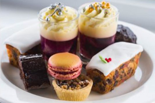 Cakes include mulled wine trifle, cranberry macaroon, chocolate orange yule log, homemade Christmas cake and of course, a mince pie.