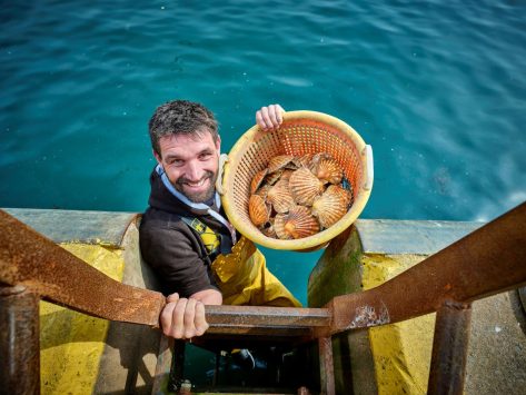 Frazer Pugh, Director of The Hand Picked Scallop Co., dives for scallops locally on England’s Seafood Coast, to depths of 10 to 29 metres. He catches around 2,000 scallops per fishing day. A portion of them go to ethical wholesalers, some go directly to restaurants on the English Riviera and around the country and the rest are processed and delivered to their nationwide customers.