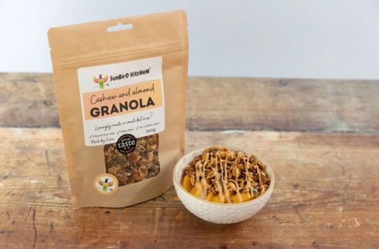 I’m loving Sunbird Kitchens. She’s a Bristol producer who makes granolas, overnight oats and things like that. She does one granola which I’m a bit addicted to. Almond and cashew nuts and the amount of nuts is phenomenal! I usually have that with some blueberries from the freezer that I heat up slightly or with strawberries and freshly grated ginger – that’s my favourite breakfast at the moment.