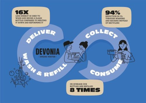 Devonia prides itself on being the only spring water company in the south of England with a business model centred around reusing glass bottles, which ensures their bottles are refilled on average eight times. To showcase this important message to consumers, Devonia introduced a new brand identity this year, which features their collect, wash and reuse process.