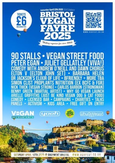 The Bristol Vegan Fayre is held at Document on Pennywell Road Bristol BS5 0TH from 10am – 6pm on Saturday April 12th 2025. Tickets are only £6 + fee in advance at www.vegfest.co.uk/bristol-vegan-fayre-2025/tickets, and £8 on the gate.