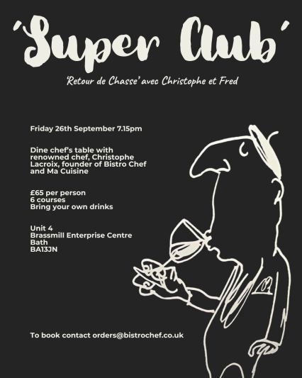 Following the success of previous supper clubs, Christophe Lacroix and Fred Fetiveau, chefs at local luxury ready meal company, Bistro Chef, are once again hosting this unforgettable evening in their Bath-based factory kitchen, and boy will it be super!